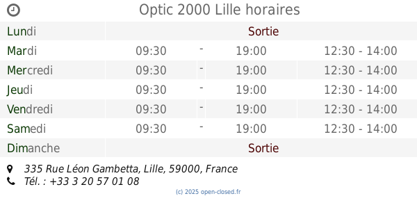 Please note that the information for Optic 2000 Dans Lille, 335 Rue Léon Gambetta and all other Stores is for reference only.